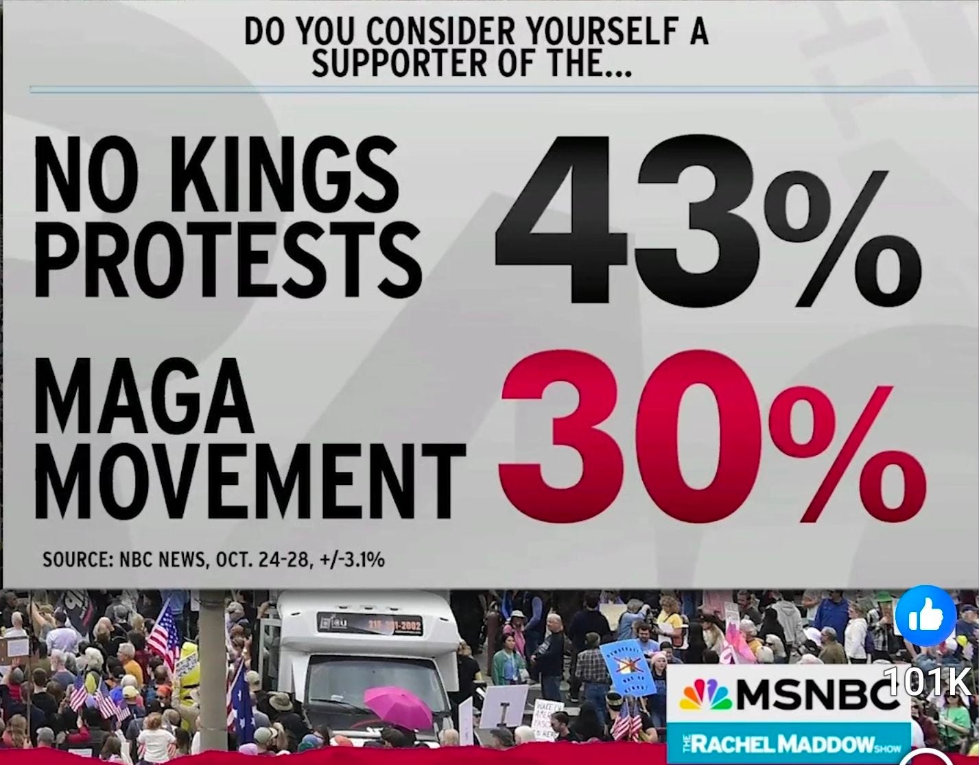 I’m going to end this part tonight with a look back to something from shortly after the last No Kings protests, in October. Rachel Maddow reported on a poll taken by NBC news during the week of October 24-28 in which they asked people whether they considered themselves to be MAGA supporters, then they asked them whether they considered themselves to be supporters of the No Kings movement.