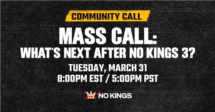 On Tuesday March 31 - the day you get this in your email if you’re a subscriber - there will be a mass call to discuss what happens next. 8 pm ET, 5 pm PT. To participate in the call, you can sign up at Mobilize.us.
